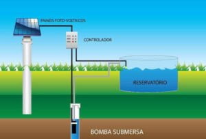 As placas solares, conhecidas também como fotovoltaicas absorvem a radiação do sol e geram energia para abastecer o sistema de bombeamento, que é composto por uma motobomba submersa ou uma motobomba de superfície com uma unidade de controle, e um sensor de fluxo, que são disponibilizados geralmente em um único kit.